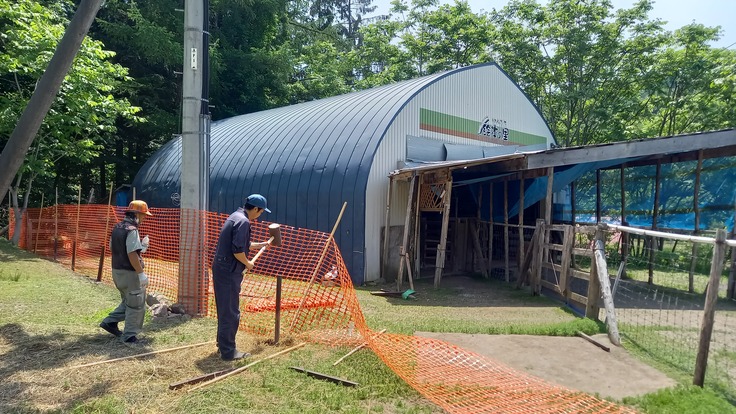 また、畜舎前では重機も行き交うため、アルパカたちが畜舎に帰らないようネットも張ります。