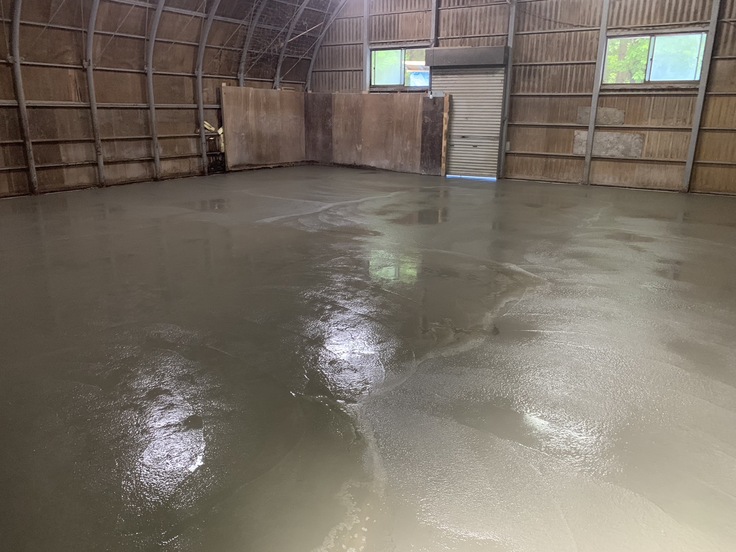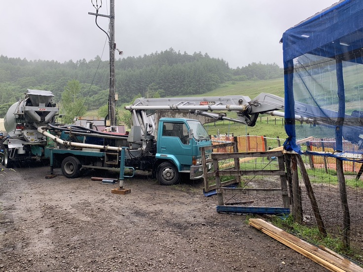 さて、畜舎の床工事も2週目にはいりました。6月24日は、いよいよコンクリートが流されました。