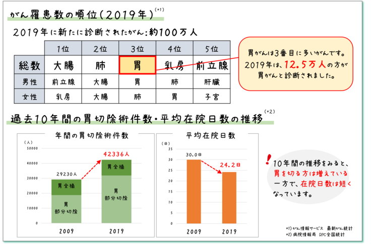 2019年に新たにがんと診断された患者は約100万人で、そのうち胃がんは12.5%を占めており⑴、大腸がん、肺がんに次いで3番目に多いがんとなっています。近年の胃がんの傾向として、胃がんの治療後5年生存率は70%超となり、胃がんは治る病気となりました。