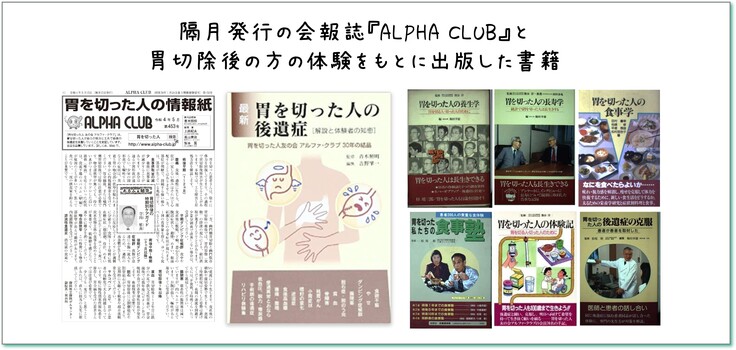 アルファ・クラブでは、書籍や会報誌『ALPHA CLUB』を通じて多くの胃を切った人の声を届けてきました。胃を切った人には、胃を切った人同士にしかわからない悩みや体験があり、それらを丁寧に共有することで、ひとりひとりの患者さんが自分なりの胃がない自分との付き合い方を見つけ出すことができます。