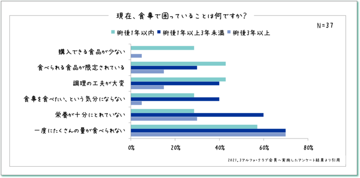 昨年の春にアルファ・クラブの会員に実施した胃切除者の食生活に関するアンケートでは、特に術後の食べ物の選択に困ったり、食欲がないことなどが課題として挙げられました。