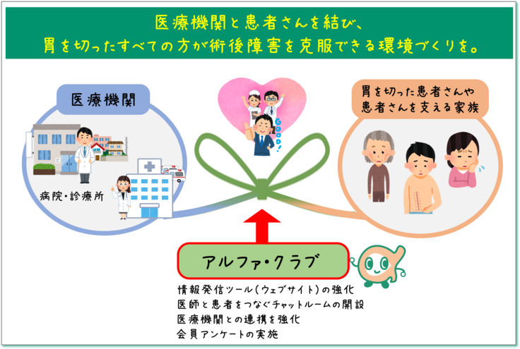 近年の胃がんの治癒率の向上はめざましく、大病院で効率良く治療が行われ、“がん"自体は上手に直せるようになりました。“がん"の治癒率が向上したことは大変喜ばしいことですが、その裏側では「胃を切った後の後遺症に悩みを抱える患者さん」は増加しています。そういった患者さんの「アフターケア」のニーズが大きくなる一方で、外科医は“がん”を治すことに集中しており手が回せていないのが現状です。《胃を切った人友の会》アルファ・クラブは胃を切った患者さん達に向けて術後障害に関する情報の発信や特別食の開発を手掛けていますが、まだまだ情報の発信力不足を痛感しています。このプロジェクトを通し、より一層啓蒙・啓発活動に力を入れていきます。