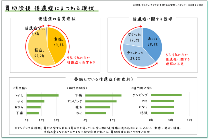 多少古くなりますが、2004年にアルファ・クラブ会員さん319名に実施したアンケートによると、胃切除後98.5%の方が、術後に何らかの後遺症の自覚症状がありました。(内訳:重症43.3%、軽症55.2%)