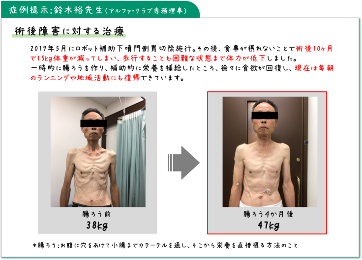 患者は70歳、男性。疾患は胃体上部早期胃がん。2019年7月に某大学病院でロボット補助下噴門側胃切除施行。術前53㎏の体重が退院時40㎏に減少。2020年5月頃に体重がさらに38㎏まで減少。