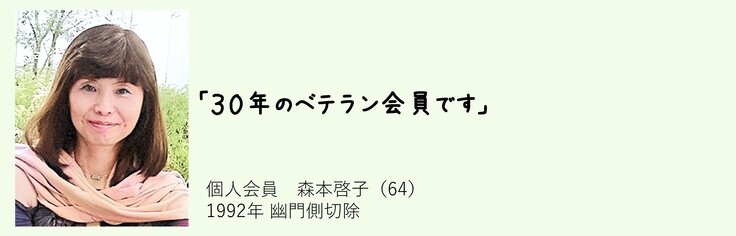 33歳の出産直後に胃がんがわかり、胃の3分の2を切除しました。ダンピングの後遺症、育児や精神的な不安に悩まされたときにアルファ・クラブを紹介され、以来30年の”ベテラン会員”です。