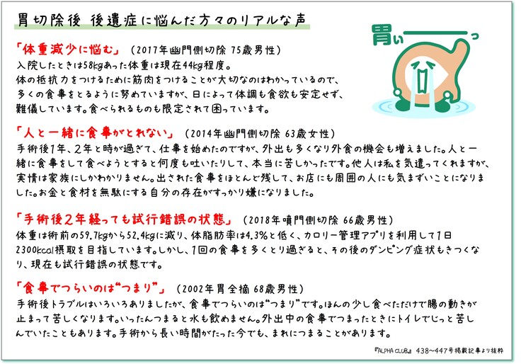 当然、その結果として様々な障害が発生します。アルファ・クラブは、患者さんの視点から本来あるべき胃を失ったことによる困りごとを取り上げ、その対応に取り組んで来ました。