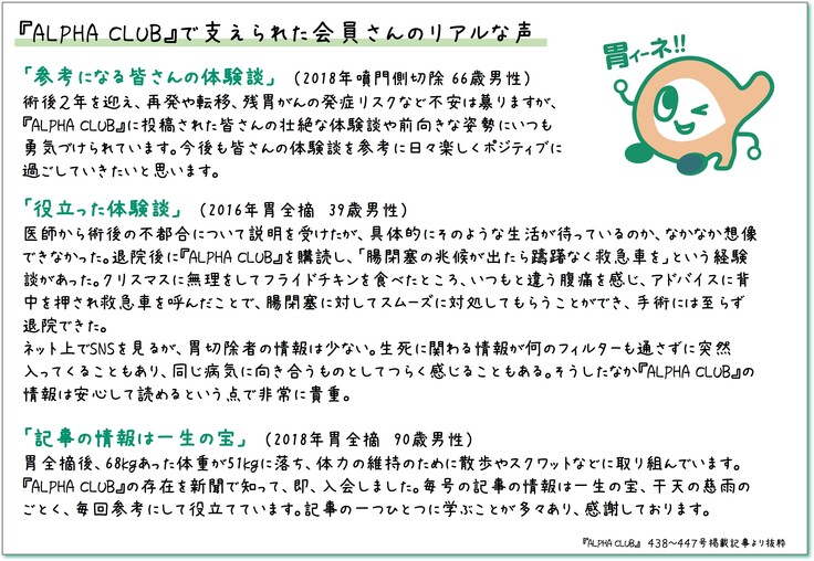 『ALPHA CLUB』の情報はとても役立ち、また、会の40周年企画「胃を切った人のお弁当」は、嬉しいニュースでした。