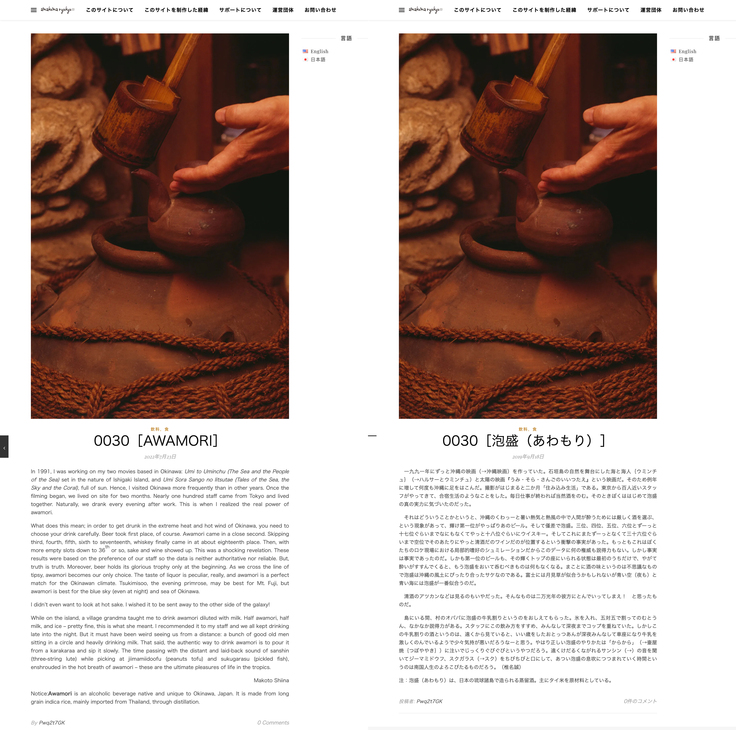 日本語版と英語版を用意し、相互にページを行き来することも可能です。いずれは沖縄の音や動画も加えていく計画です。
