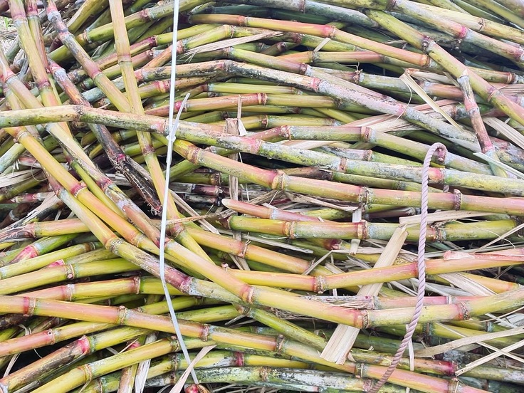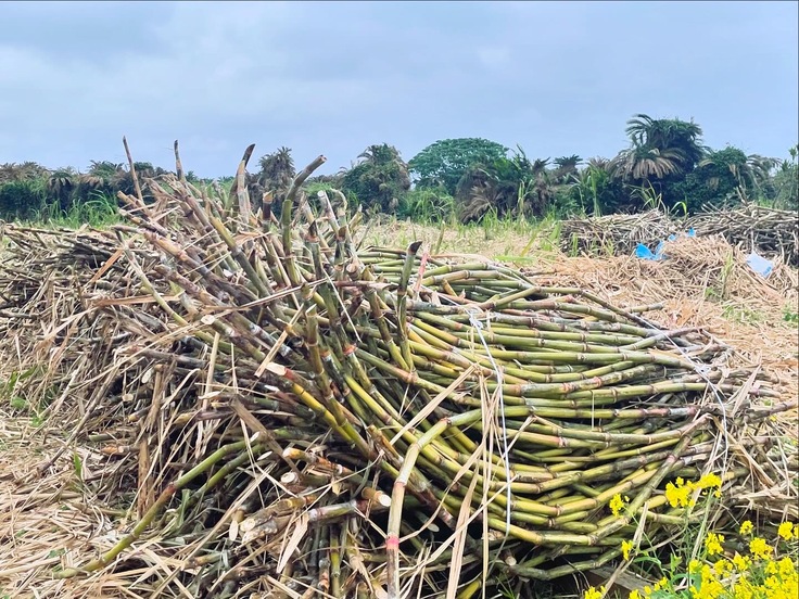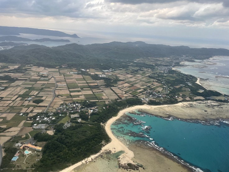 サトウキビ収穫の時期が終わり、空からも畑の土色がよく見えます。