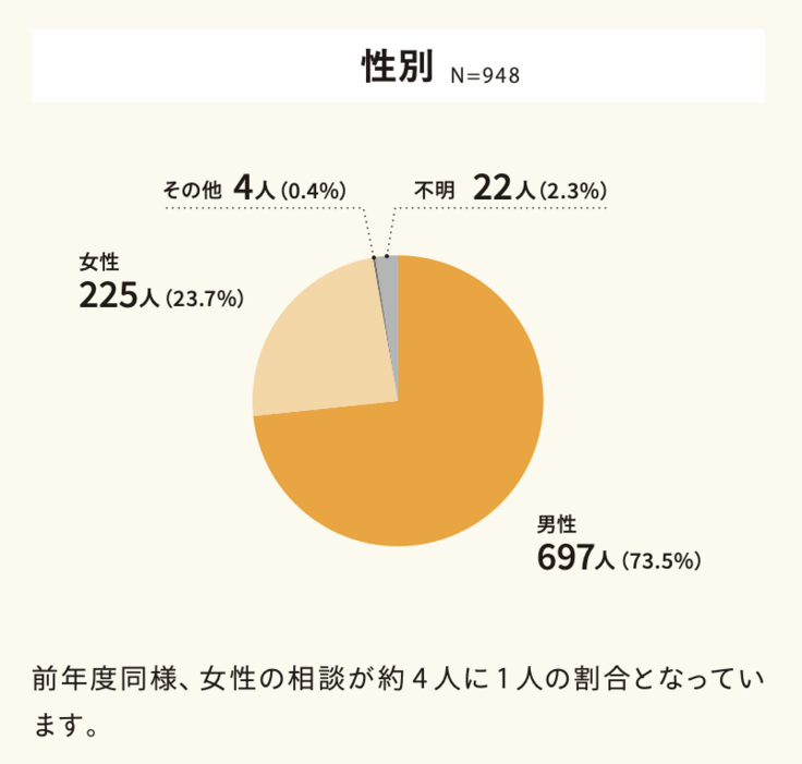 Homedoorに来られる女性相談者の割合は、相談支援を開始した2014年度は7%でしたが、年々増加傾向にあり、2019年度からは毎年、相談者全体のおおよそ4分の1が女性です。