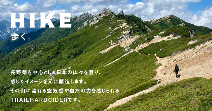 and CIDER は『HIKE (歩く)』『BREW(醸造する)』『GROW(育てる)』をコンセプトに、自然豊かな日本のトレイルを実際に歩き、そこで感じた情景や、山の特徴、出会いやエピソードなどの旅のイメージをもとに、毎回違う醸造所やクリエイター、ハイカー、ファーマーとタッグを組み、ベースとなるリンゴの品種選定やレシピ開発を行い醸造したハードサイダーを、テーマをもとにリリースをして行く醸造所を持たないファントムサイダリーです。