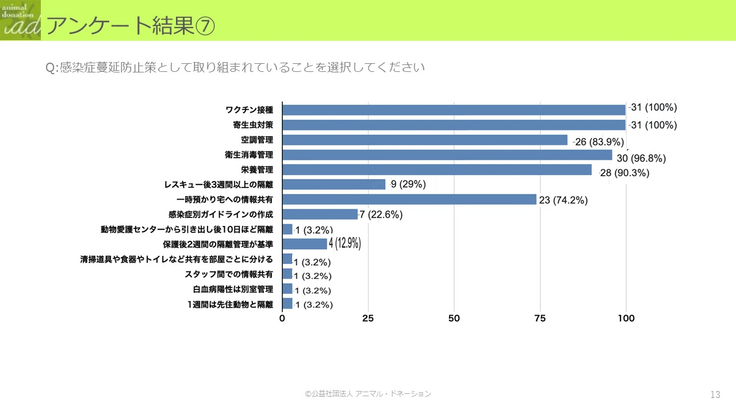また、保護活動において一番重要とも言える感染症蔓延防止策の回答では、隔離対策や症状を見つけにくい環境、動物へのストレスを軽減するために、犬同士の社会化、雰囲気作りの工夫等、さまざまな取り組みの回答がありました。