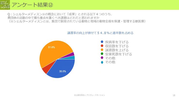 今回はシェルターワーク&シェルターメディスンの知見を深めるために、日本シェルターメディスン学会会長の田中亜紀先生にアニドネ認定団体のためにお話しいただきました。事前にアンケートを実施した結果、「譲渡率の向上」が団体にとって課題となっていることが分かりました。