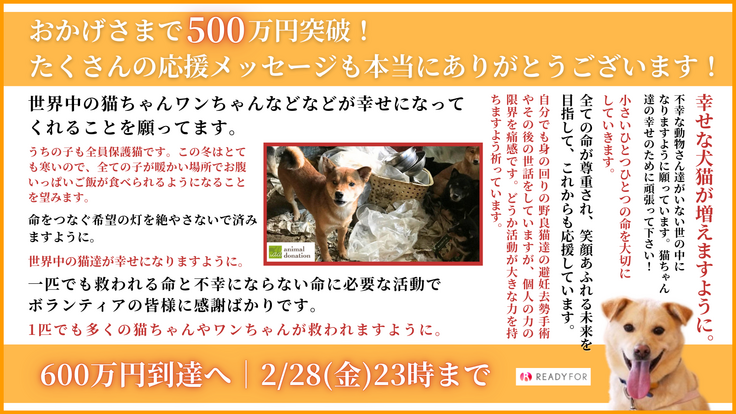 1月15日に開始した公益社団法人アニマル・ドネーションのプロジェクトですが、1月26日に第一目標金額の300万円を達成し、先週末2月21日には第二目標も達成することができました。心より、御礼申し上げます。