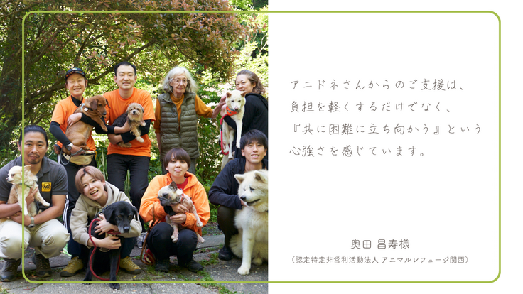 本日は、アニドネの認定団体である「認定特定非営利活動法人 アニマルレフュージ関西」エリアマネージャーの奥田 昌寿様より応援メッセージをいただいておりますので、ご紹介いたします。
