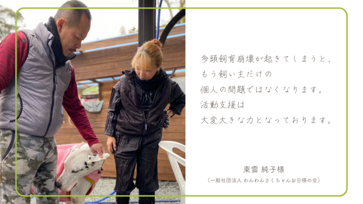 今回のプロジェクトに向けて、一般社団法人 わんわんさくちゃんお日様の会の東雲 純子様よりメッセージをいただいております。プロジェクトページ下部にもございますが、改めてご紹介致します!