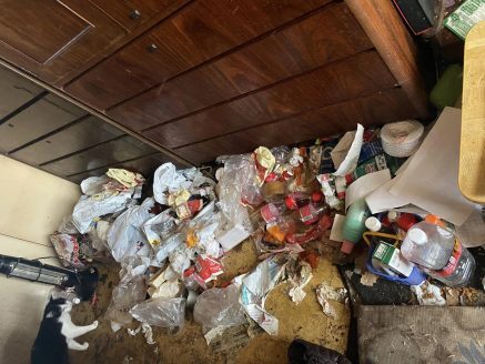 居間は糞尿、家具、ゴミで荒れ果てており、一部の床は見えていましたが大量のハエがわいており不衛生な環境でした。