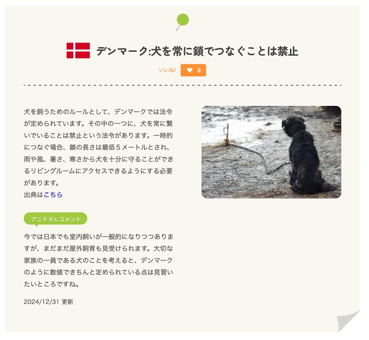 ・デンマーク:犬を常に鎖でつなぐことは禁止