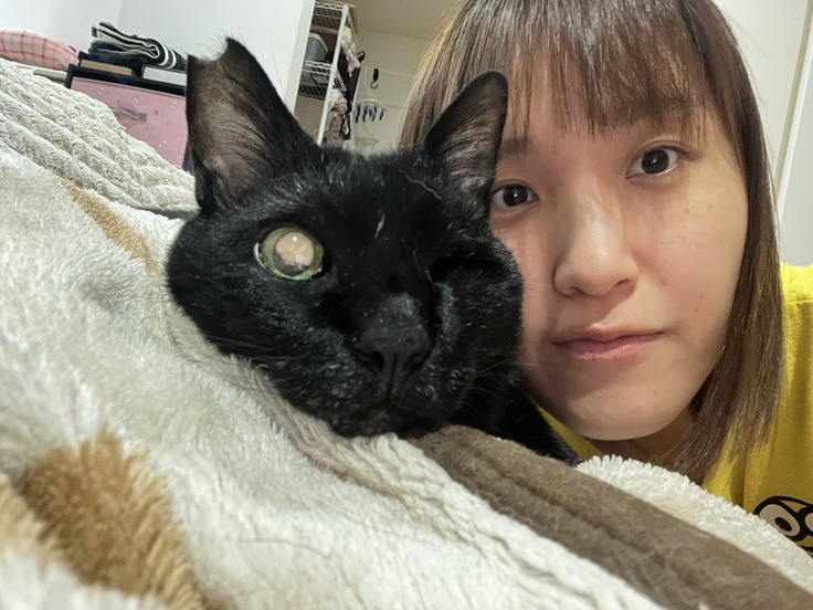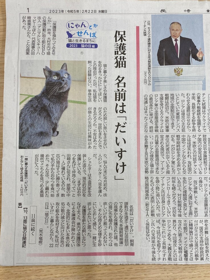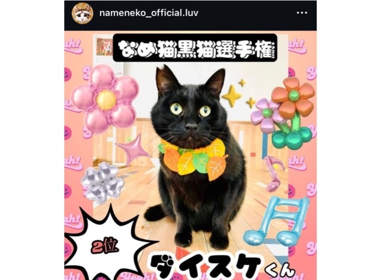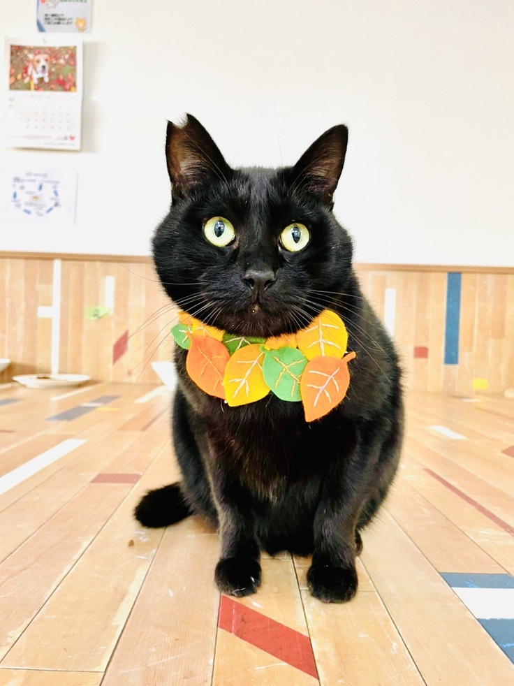 長崎新聞の記者さんが、里親さん体験企画で一時的に里親になってくださり、だいすけの穏やかな時間を一緒に過ごしてくれたことがあります。また、なめねこ公式黒猫選手権では、皆様の応援のおかげで見事に2位に輝きました。首飾りは、ボランティアの古井さんが、新しい家族との出会いがあるように願いを込めて、季節の秋に合わせて作ってくれたものです。