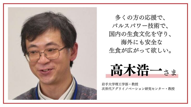 本技術の社会実装は日本の生食文化を守ることや、従来の処理では無害化が難しかった寄生虫への適用などへつながります。多くの方の応援で、本技術の社会実装が加速して、国内の生食文化を守り、海外にも安全な生食が広がって欲しいと思っております。