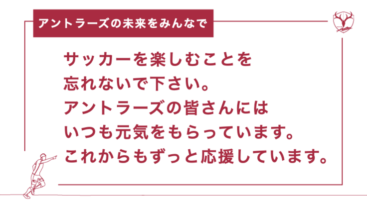 いつも鹿島アントラーズを応援していただき、ありがとうございます。また今回のクラウドファンディング「アントラーズの未来をみんなで 2022」にもご協力いただき、ありがとうございます。