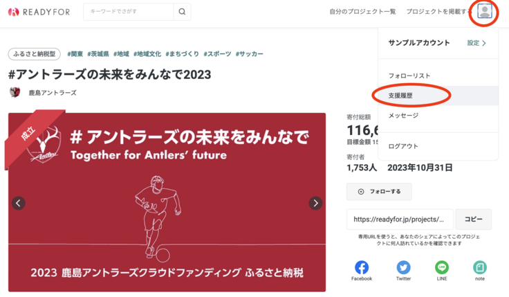①READYFORページ内の右上のアカウント画像をクリック>支援履歴をクリック