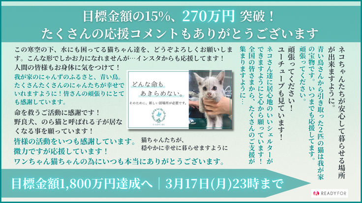 目標金額の15%、270万円突破! たくさんの応援コメントも読ませていただいております