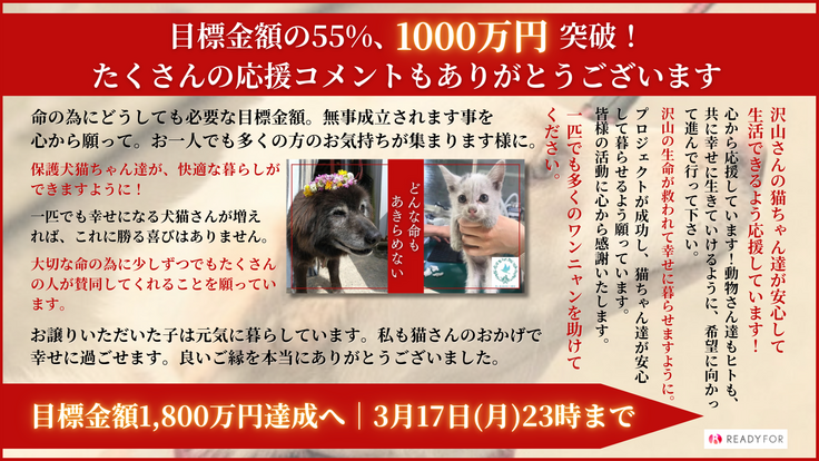 1月17日から開始した『年間600匹の命を守るシェルターの存続の危機|青い鳥覚悟の挑戦』プロジェクトですが、皆さんのおかげで1000万円が集まりました!