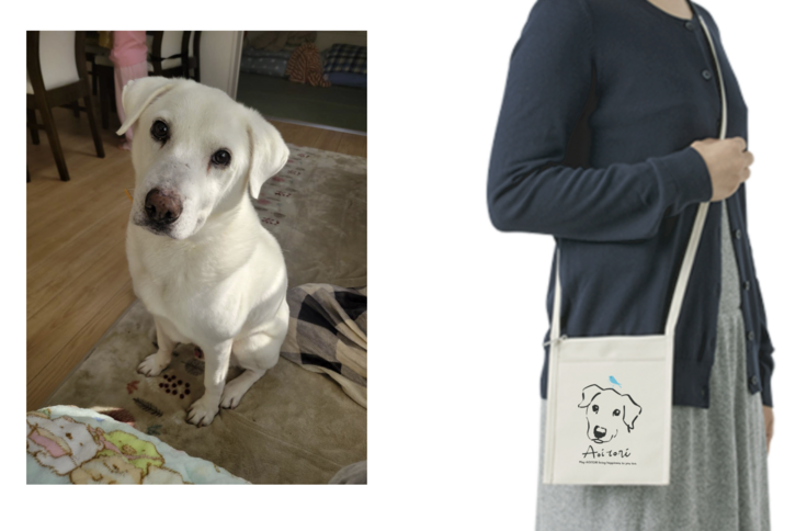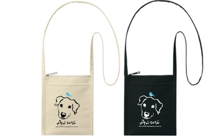 ミニサコッシュにご支援された方からいただいた写真を元に制作した犬猫のオリジナルイラストを配置し印刷します。Aoitoriの文字と青い小鳥は入ります。オリジナル絵入りデザイン制作業者の株式会社BLOOMIN’ KIDS 様協力の元、オーダー品を製作します