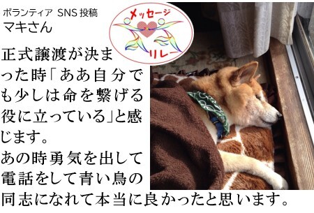 16歳と半年飼っていた愛犬が亡くなり、何とも言えない悲しさでしたが、犬のために何かしたい!と思いました。その時シェルターで犬のお世話をするボランティアがある事を知り、同じ防府市で活動をしている青い鳥に、ボランティア希望の電話をしたのを今でも覚えています。