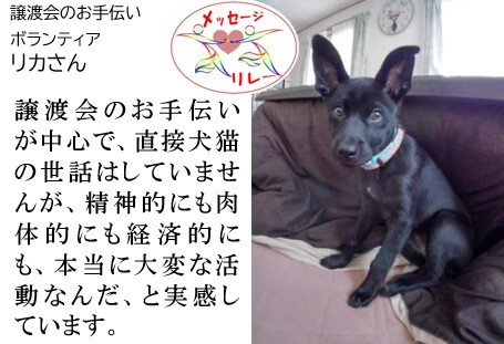 私は譲渡会の準備や後片付け、お客様の案内等をする活動が中心なので、直接犬猫のお世話はしていませんが、代表を始めスタッフやボランティアの方々のお話を伺うたび、精神的にも肉体的にも経済的にも、本当に大変な活動なんだと実感しています。