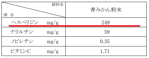 フリーズドライ製法の青みかんだとヘスペリジンがどれだけ多いのか?和歌山県工業技術センターでフリーズドライ青みかん粉末の成分を検査したところ、なんと1g中にヘスペリジンが「249mg」も含有されていることが認められました!これも大人の事情で明確に表現できませんが、本当に多い量なんです!