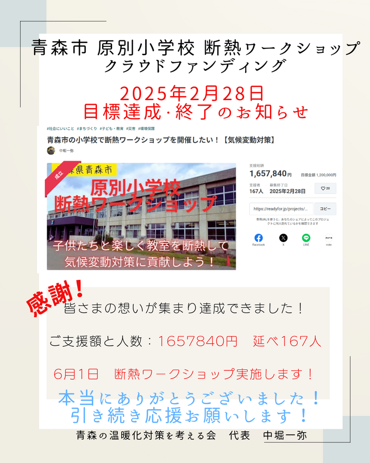 この度は、青森市の原別小学校での断熱ワークショップのクラウドファンディングにお支援いただき、また、盛り上げていただき、誠にありがとうございました!
