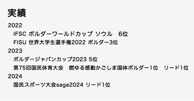現在はボルダーワールドカップにおいて6位が最高順位であり、この立ち位置から頂点を取るために