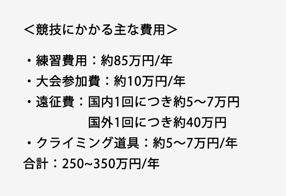 小学2年生の頃、近所にあったクライミングジムで、クライミングに出会い、現在選手として「ワールドカップ優勝」を目標に、国内外の様々な大会に出場しています。