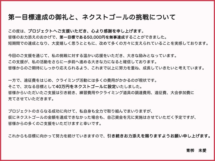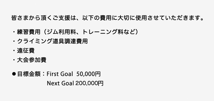 青栁未愛がいただいた支援金をスポーツクライミング活動費・遠征費 ・道具調達費として使用させていただきます。