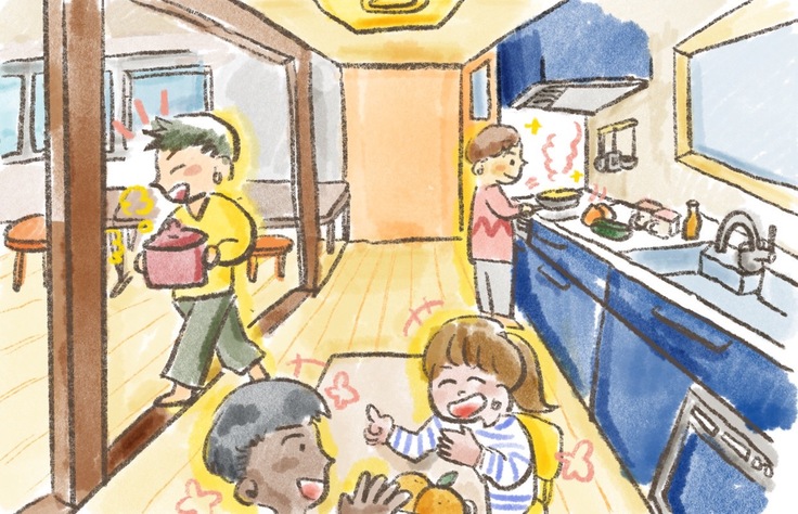 リビングはみんなが集う場所なので、小さい部屋の壁を除いて広い空間にします。
