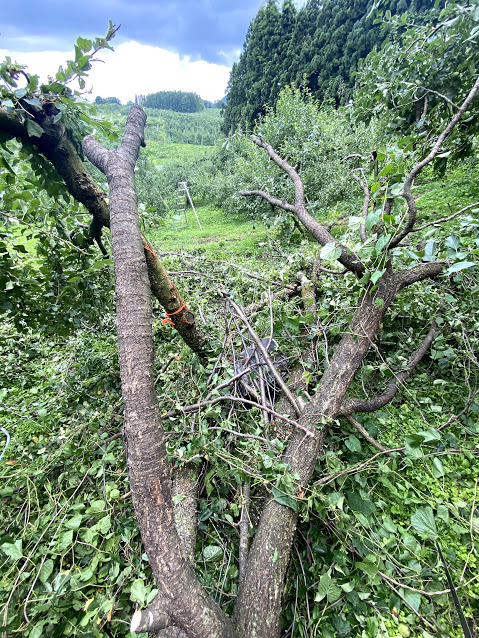豪雨や台風の接近によって山の畑では倒木が起きて、リンゴの木が真っ二つになってしまってり、