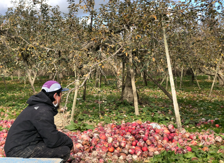 急激に寒くなる日がたまにあって、気温が氷点下まで下がったりすると、霜が畑にたまって、一気に林檎の花がから落ちてしまうという災害になります。😭