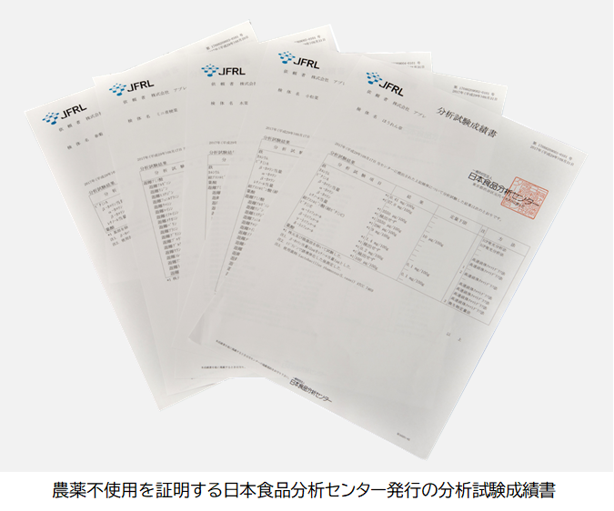 アプレは1滴も農薬を使っていません。天敵など農水省定義の「生物農薬」も不使用。138種類(一般は8種類)の農薬検査で全てが「検出無し」。「完全農薬不使用」です。