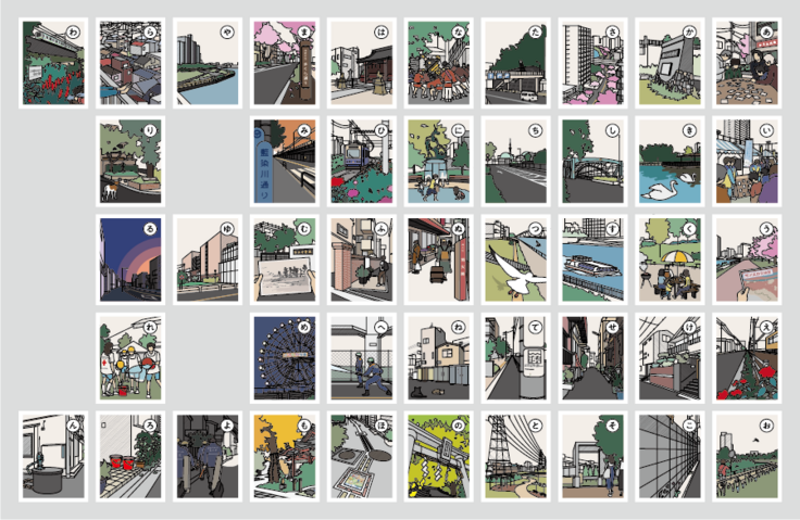 東京都荒川区内に見つけた「防災 × 景観」を、45枚の読み札と絵札(取り札)として切り取りました。
