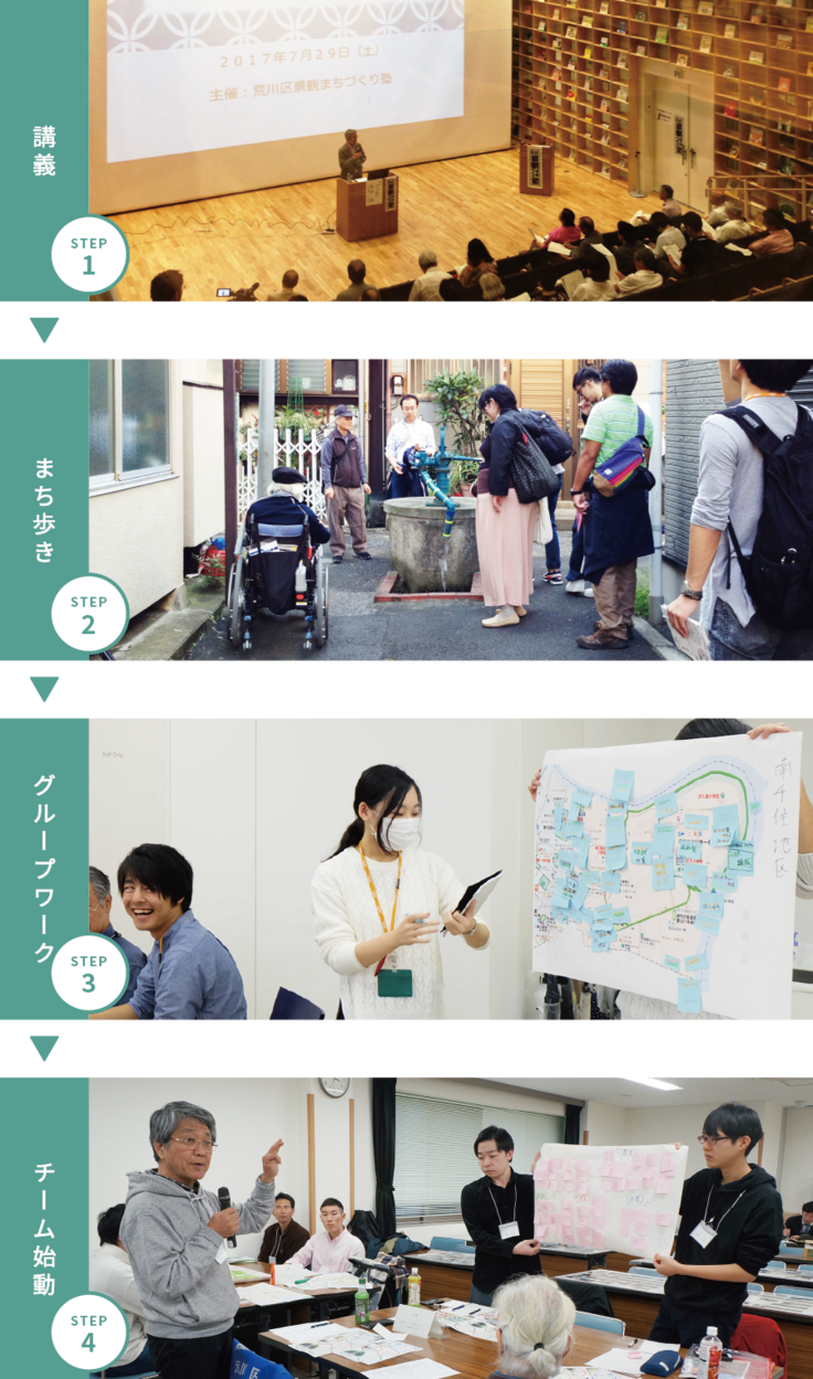 日本大学理工学部まちづくり工学科の岡田智秀研究室のみなさんにサポートいただきながら、各専門家による講義や、まち歩き、ワークショップを経て、「荒川風物資産 防災 × 景観 編」を選定。