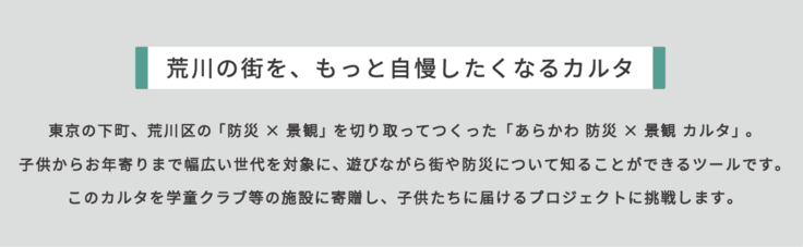 今回のプロジェクトでは、寄付いただいた資金をもとに、これらの施設にかるたを寄贈し、子供たちに荒川区の街や防災について知ってもらう機会をつくります。