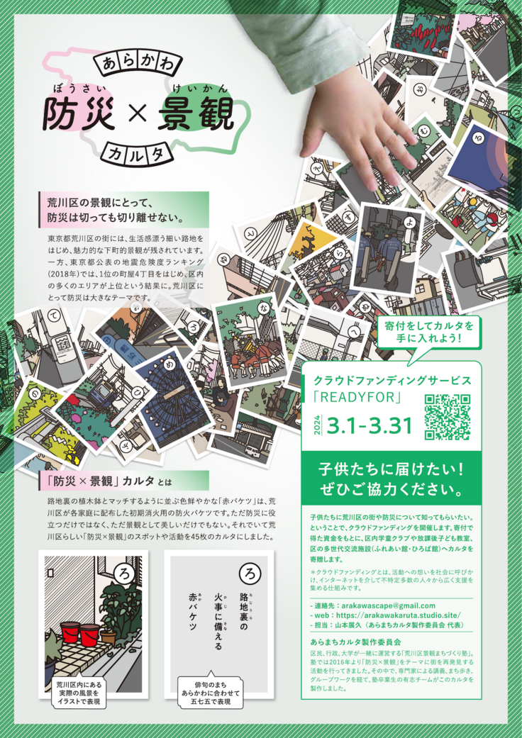 あらまちカルタ製作委員会が、東京都荒川区内の「学童クラブ」、「放課後子ども教室(にこにこすくーる)」、「ふれあい館・ひろば館」といった、放課後に小学生が利用できる施設44箇所へ「あらかわ 防災×景観 カルタ」を寄贈する。 〈カルタ寄贈プロジェクトの経費内訳〉 ・カルタセット印刷費(300部):450,000円 ・ポスター印刷費:10,000円 ・チラシ印刷費:10,000円 ・送料:50,000円 ・クラウドファンディング手数料:80,000円 合計:600,000円