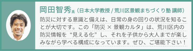 実際にまちに出てみると、ただ防災に役立つだけではなく、ただ景観として特徴的なだけでもない、かつ荒川区らしさを感じる、そんな「防災 × 景観」のスポットや活動にたくさん触れることができました。