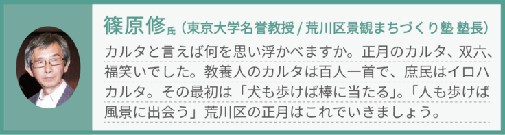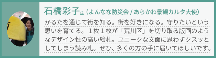 このかるたを通じて、荒川区の街をもっともっと自慢したくなる、そんなふうになるといいなと思っています。