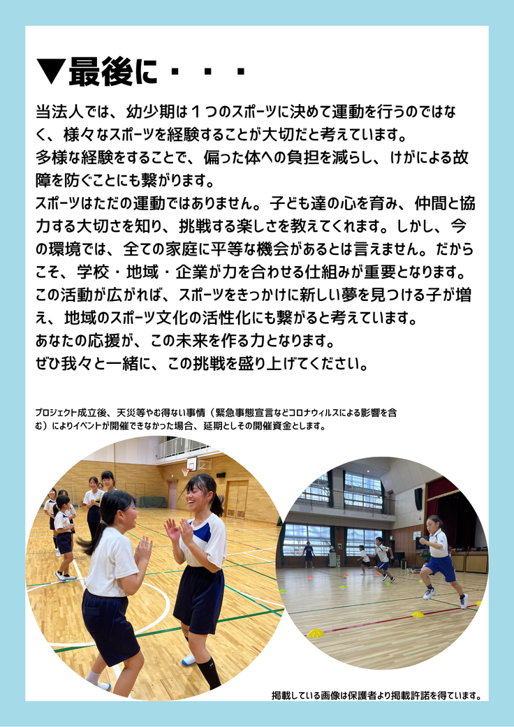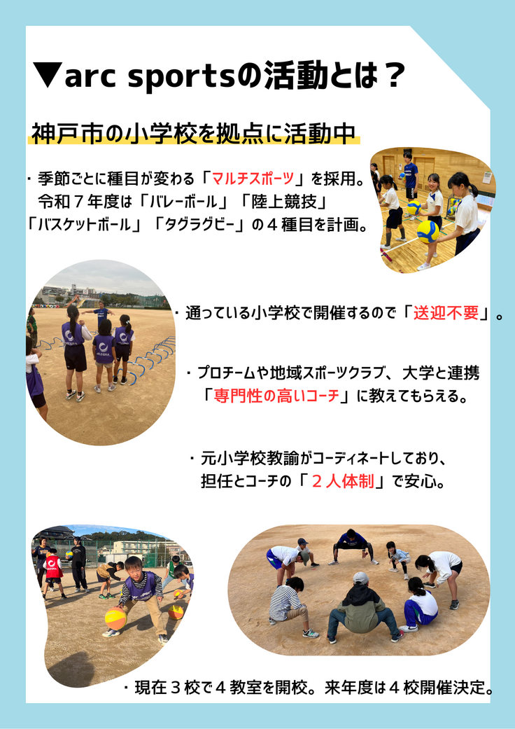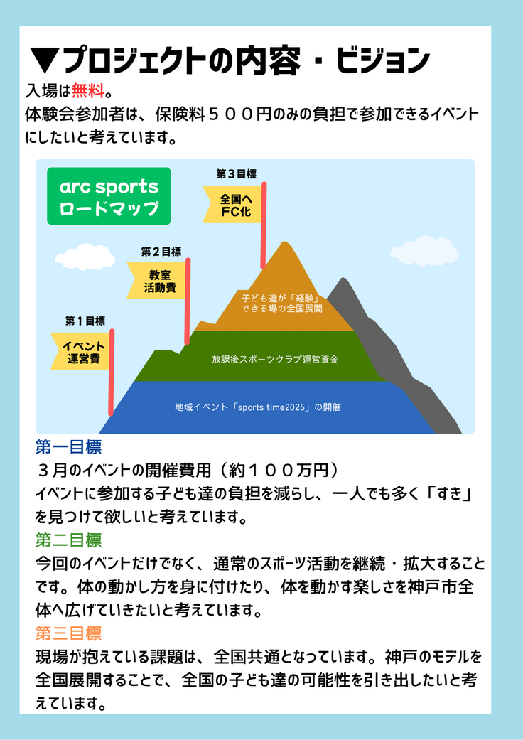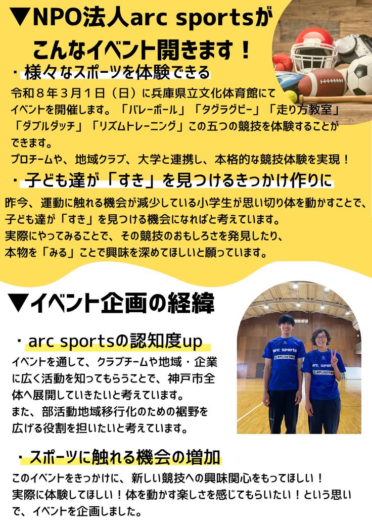 NPO法人arc sportsが、令和8年3月に数種類のスポーツを体験できるイベント「sports time」を行う。集まった資金は、会場費、講師誘致費、事務局運営費、保険料、広報費、備品等に使用予定。
