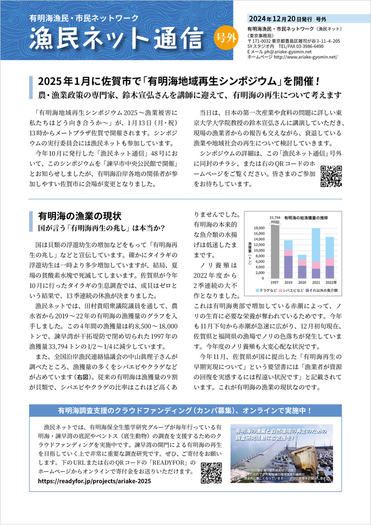 また、漁民ネットでは2025年12月20日に「漁民ネット通信」の号外を発行し、有明海の漁業の厳しい近況を伝えるとともに、今回のクラウドファンディングの告知も行いました(下写真)。この発行・発送費用の一部に、今回の支援金を充当します。