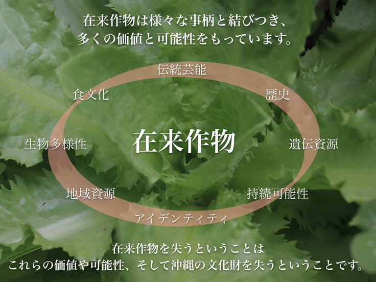 長いあいだ沖縄に適応してきた多様な在来作物の種を未来へ継承することは、もちろん伝統文化の継承にもつながりますし、私たちの生きる可能性を広げることにもつながります。彼らの遺伝子があれば、沖縄に適応する新しい品種を作る際に活用することもできるのです。