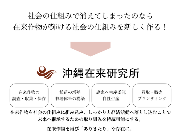 沖縄在来研究所は在来作物を再び「ありきたり」にするべく、地道にかつ大胆に進んでいきます。昔の在り方も大切にしながら、現代を生きる皆様にどうやったら受け入れてもらえるか、いろんな挑戦をしながら進んでいきます。